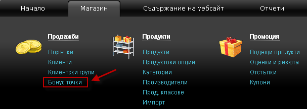 - От следващата страница изберете таба - Бонус точки и пред Вас ще се зареди страницата с всички настройки на бонус точките.