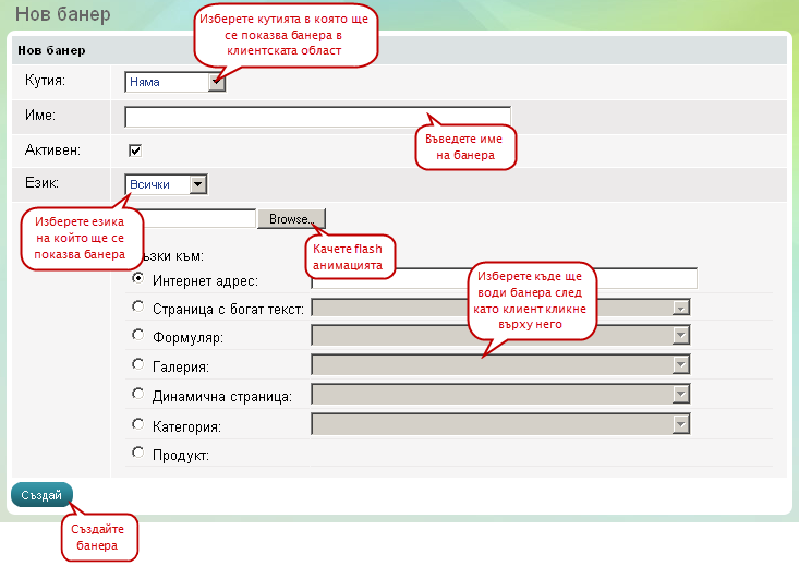 Изберете този вид банер ако искате да качите flash анимация за банер. Позволения формат е swf.
