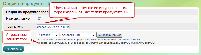 Таен ключ: Ключът доказва, че само хора, на които собственоръчно сте предоставили продуктовият feed ще изтеглят продуктите Ви.