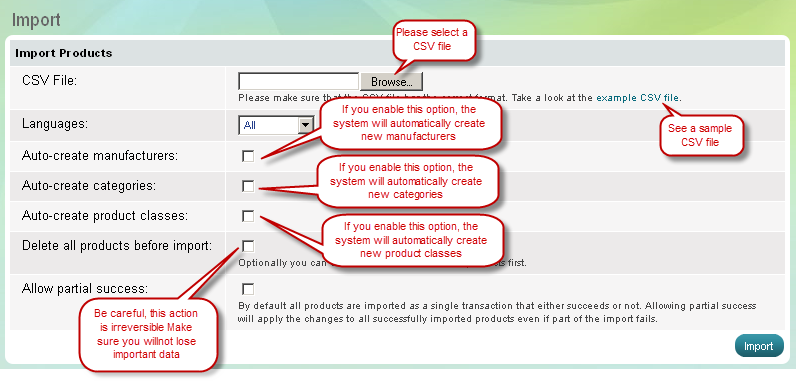 "Supprimer tous les produits avant importation" - Cette option est utile quand vous commencez un nouvelle boutique et vous devez supprimer les produits de démonstration dans votre installation de Summer Cart. Soyez prudent quand vous utilisez cette option comme l'action est irréversible. Si votre boutique a des produits réels assurez-vous s'il vous plaît que vous ne perdrez pas de données importantes en supprimant tous les produits