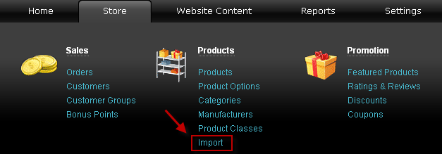 Ouvrir le Panneau d'administration de Summer Cart. Cliquer sur le lien "Import" de menu Boutique - Produits. La page "d'importation" apparaît.
