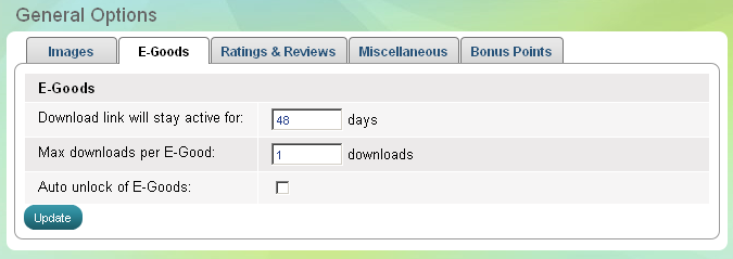 E-produits sont des fichiers numériques et ils peuvent être téléchargés à partir de votre magasin par le biais d'un lien de téléchargement. À la page "Options générales", vous pouvez définir combien de jours le lien de téléchargement restera actif, combien de téléchargements pour un e-produit sont autorisés et vous pouvez activer / désactiver déverrouillage automatique de e-marchandises. Si le déverrouillage automatique est activé au cours d'une commande avec un lien de téléchargement nouveau statut sera envoyé au client, sinon vous devez d'abord déverrouiller le e-produit manuellement à partir de la page. Pour plus de détails vous pouvez voir les instructions comment débloquer e-marchandise manuellement ici.