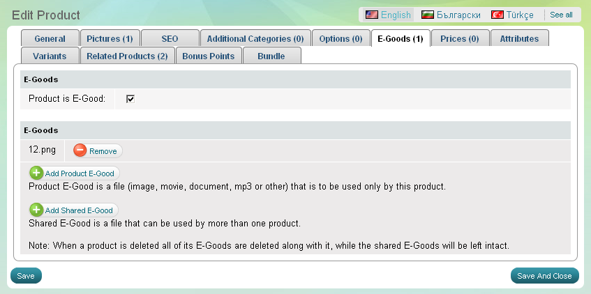 Tout d'abord, vous devez confirmer que ce produit est un e-marchandise. Ensuite, vous choisissez entre 2 options: Ajouter produit E-marchandise et Ajouter E-marchandise partagée. Produit e-marchandise est un fichier (image, vidéo, document, mp3 ou autre) qui doit être utilisé uniquement par ce produit. E-marchandise Partagé est un fichier qui peut être utilisée par plus d'un produit.