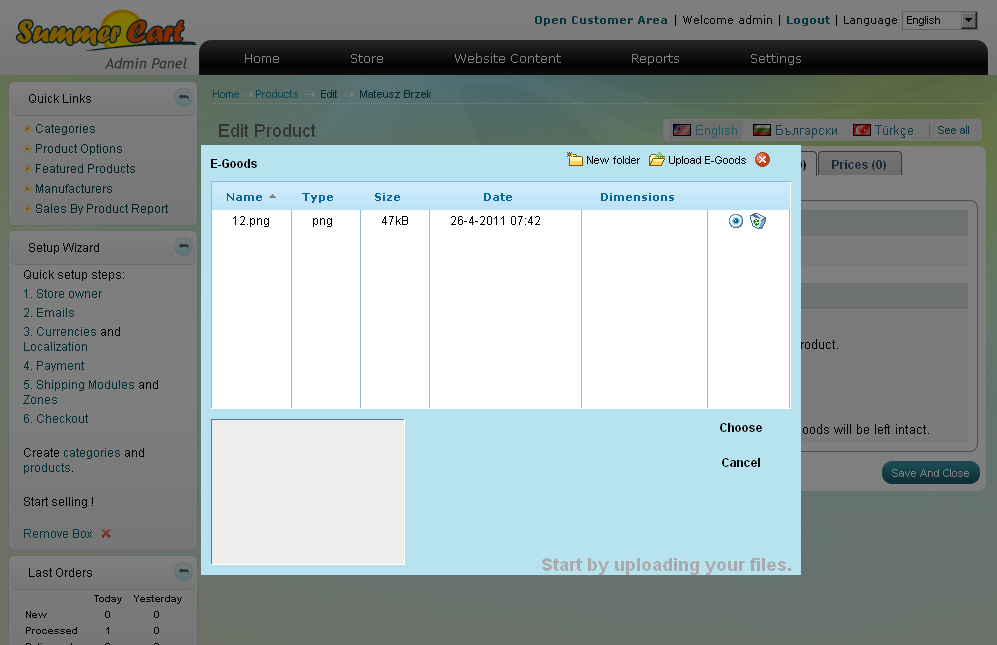 Pour commencer le téléchargement de fichiers cliquez sur le bouton "Ajouter produit E-marchandise" ou sur "Ajouter E-marchandise partagée". Une boîte de dialogue spécial apparaît.
