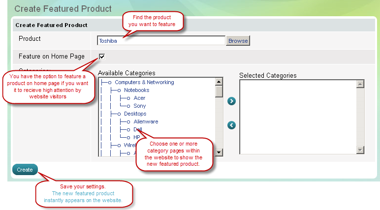 Cliquer sur le bouton "Nouveau produit vedette". La page "Créer produit vedette" apparaît.