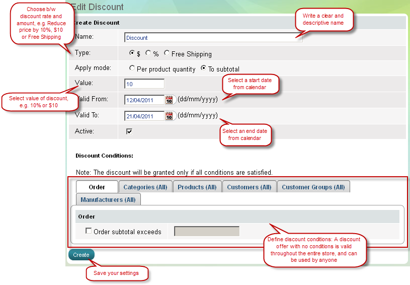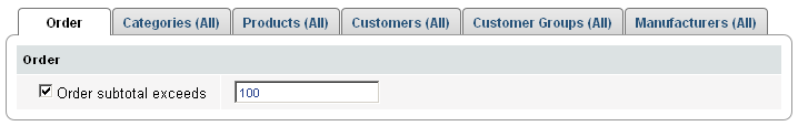 Par cette page vous pouvez éditer les paramètres généraux de réduction. Vous pouvez également appliquer des conditions. Les 6 onglets vous permettent de gérer des conditions comme montant minimum de commande, catégories de produits sélectionnés, des produits sélectionnés et les clients sélectionnés.