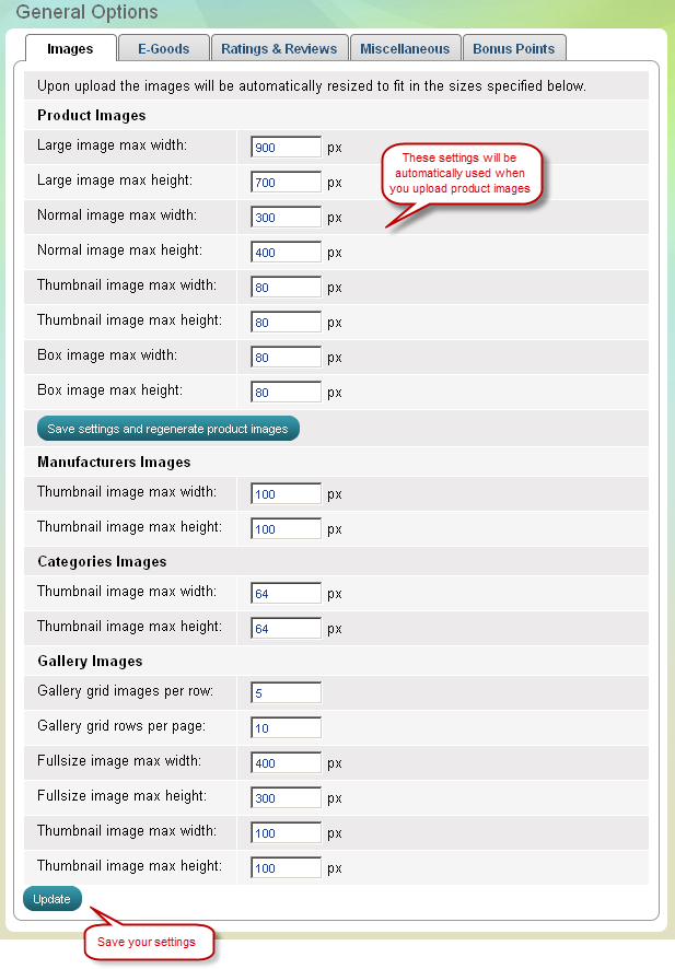 Réglage de la largeur et la hauteur maximum de l'image produit : large, normal, vignettes et les image de boîte. Après avoir modifié les valeurs cliquer sur le bouton "Enrégistrer les paramètres et régénérer les images produits".