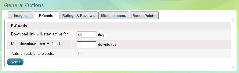 E-produits sont des fichiers numériques et ils peuvent être téléchargés à partir de votre magasin par le biais d'un lien de téléchargement. À la page "Options générales", vous pouvez définir combien de jours le lien de téléchargement restera actif, combien de téléchargements pour un e-produit sont autorisés et vous pouvez activer / désactiver déverrouillage automatique de e-marchandises. Si le déverrouillage automatique est activé au cours d'une commande avec un lien de téléchargement nouveau statut sera envoyé au client, sinon vous devez d'abord déverrouiller le e-produit manuellement à partir de la page.