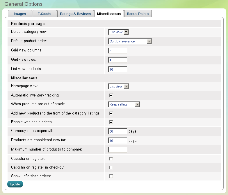 La page "Options générales" vous permet de configurer les opérations de base de la boutique en ligne.