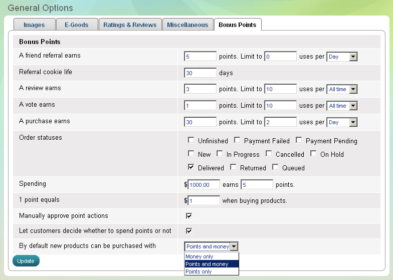 Par défaut les nouveaux produits peuvent être commandés avec – argent uniquement, points seulment ou points et argent.