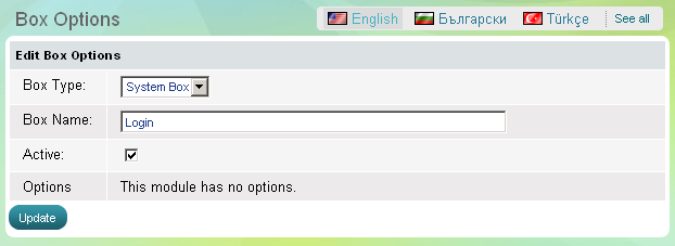 Utilisez l'encadré "Connexion" pour permettre aux visiteurs du site de s'enregistrer dans votre magasin et se connecter à la boutique. Une fois qu'ils sont connectés, ils peuvent également se déconnecter. L'encadré a un paramètre - d'être actif, ce qui signifie qu'il est visible sur le site, ou l'inverse - comme inactif, alors l'encadré entier disparaît.