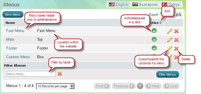Le nom du menu est utilisé pour identifier un menu dans le Panneau d'administration Summer Cart et n'est visible qu'aux administrateurs. Outre le nom du menu, l'administrateur définit un Titre du menu qui est visible pour le public et peut être affiché en plusieurs langues.