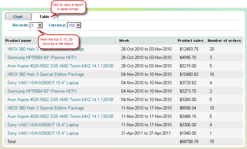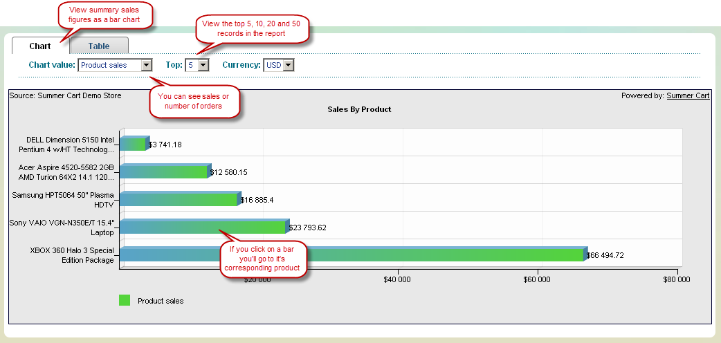 Summer Cart génére des rapports de synthèse par des graphique à barres et sous forme de tableau, et des rapports détaillés par des graphiques en ligne et sous forme de tableau.