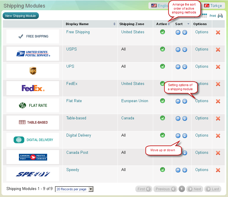 - free shipping, flat rate shipping, table based shipping et trois modules pour le calcul des frais en temps réel - FedEx, USPS et UPS.