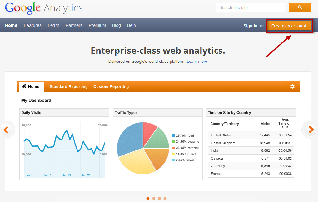 Visit http://www.google.com/analytics/ and whether you have a google account (gmail, webmaster tools or else) or not, you can either click “Sign-In” or create a Google Analytics account by clicking “Create Account” (both buttons are located in the upper corner at the right-hand side of the screen)