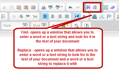 Replace - opens up a window that allows you to enter a word or a text string to look for in the text of your document and a word or a text string to replace it with