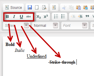 The next group of buttons enables you to apply bold,. italic, underlined and strike-through styles to your text