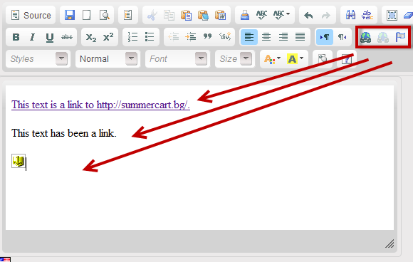 Unlink - mark a link, click this button and the link will be removed. Only plain text will be left