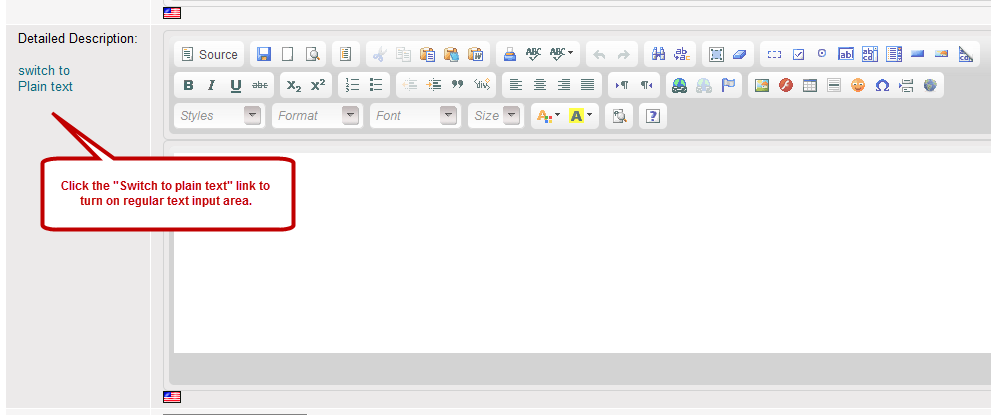 4. The WYSIWYG editor appears in front of you. Click the "Switch to plain text" link to turn on regular text input area.