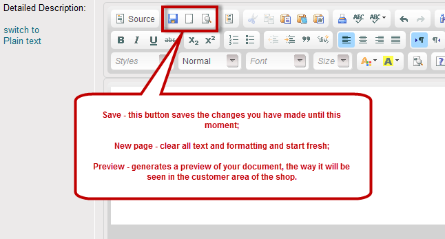 Preview - generates a preview of your document, the way it will be seen in the customer area of the shop.