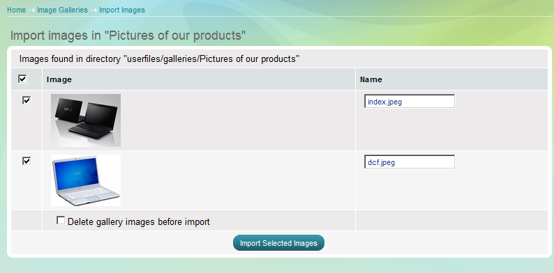 - all the images that were located in the folder are visualized here and you can choose which ones should be imported in the gallery by checking their boxes