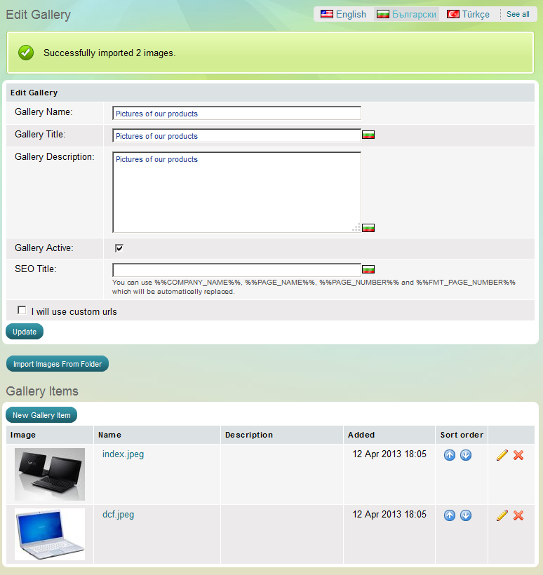 - connect to the server via FTP and upload images to the automatically created folder "userfiles/galleries/pictures of our products" (the system automatically creates a folder with the name of the gallery upon gallery creation)