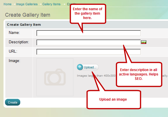After having created a gallery, you need to add images to it.