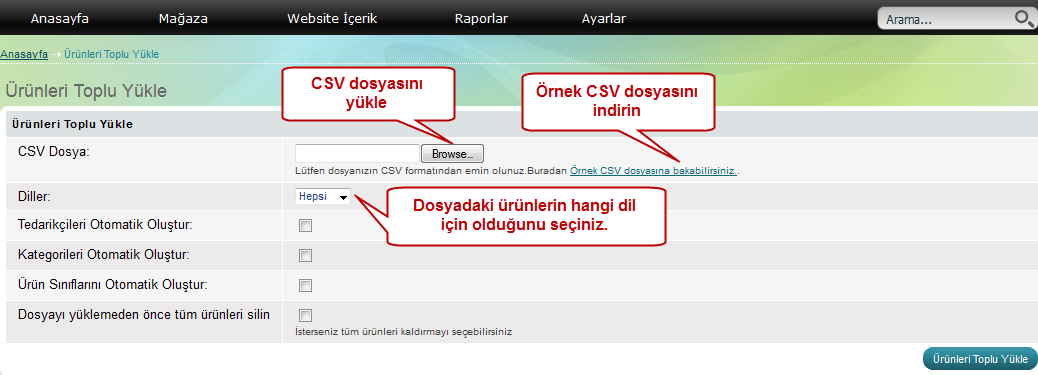 CSV ile ürün yüklemek için "Mağaza" >> "Ürünler" >> "Yükle" menüsüne girmeniz gerekiyor.