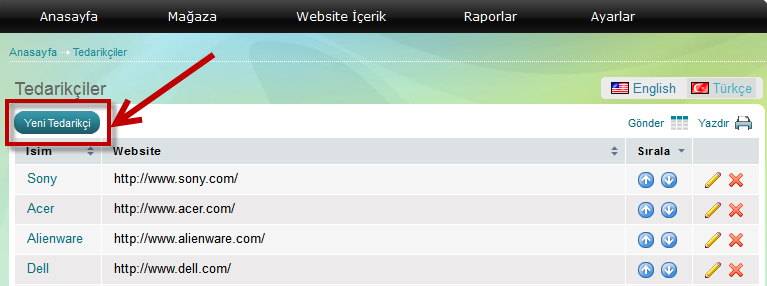 1. Mağazanın admin panelini açıp menüden "Mağaza" >> "Ürünler" altında "Tedarikçiler" bağlantısına tıklayın.