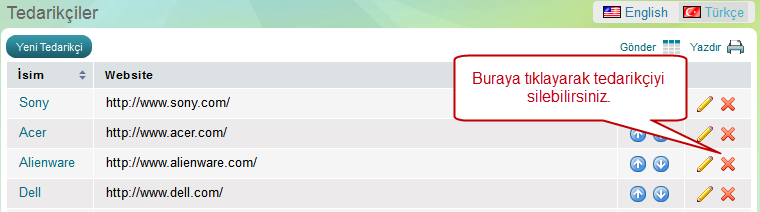Mağazanın admin panelini açıp menüden "Mağaza" >> "Ürünler" altında "Tedarikçiler" bağlantısına tıklayın. Silmek istediğiniz tedarikçiyi bulduktan sonra sıranın sonunda sil butonuna tıklayın. Açılan pop-up sayfada silmek istediğinizi onayladığınızda tedarikçi silinecek.