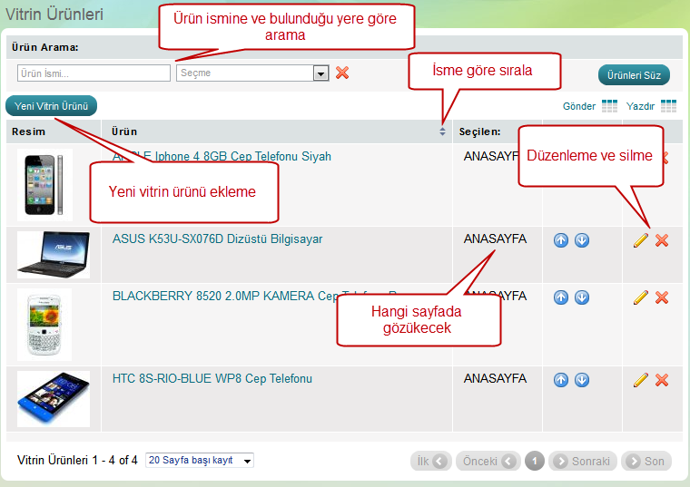 Vitrin ürünleri sayfası ürünler hakında bağzı detayları görebilirsiniz. Ürünleri arayabilir, resimleri olup olmadığını kontrol edebilir ve hangi kategoride yer aldığını görebilirsiniz. Vitrin ürünleri sitenin anasayfasında göründüğü gibi kategori sayfasındada görünebilir. Ürünün sırasının sonundaki düzenleme ikonuna tıklayarak nerede görünmesini istediğinizi belirleyebilirsiniz.