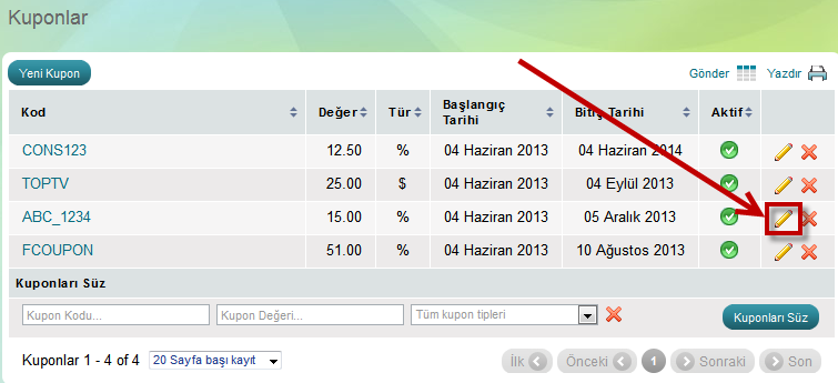 2. Kupon seçip sıranın sonunda düzenle ikonuna tıklayın. "Kupon Düzenle" sayfası açılacak.