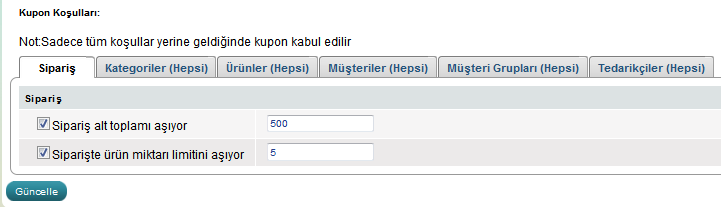 Aynı anda minimum sipariş fiyatı ve siparişte ürün adeti girerek kuponun kriterlerini kombine edebilirsiniz. Örneğin müşteri en-az 4 ürün ve toplam fiyat 1000TL olduğunda kupon uygulanabilir.