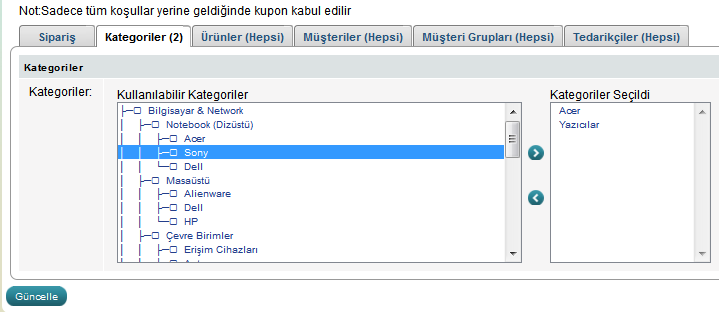 "Kupon Düzenle" sayfasında "Kategoriler" bölümü