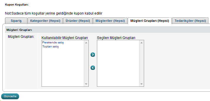 Müşteri grubu eklemek için müşteri grubunun üzerine bir kez tıklayın ve yön butonlarını kullanarak diğer tarafa ekleyin. Diğer taraftaki müşteri gruplarına kupon uygulayabilirsiniz.