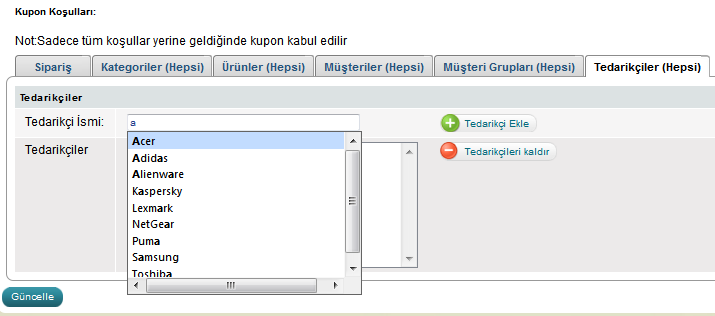 Tedarikçi eklemek için "Tedarikçi İsmi:" alanına tam ismi ve bir kısmını girin. Açılır menü şeklinde mağazanızaki tedarikçilei göreceksiniz. Seçtiniz tedarikçinin üstüne tıklayarak "Tedarikçi Ekle" butonuna tıklayarak ekleyebilirsiniz. Bu şekilde tedarikçiyi kupona kriter olarak ekleyebilirsiniz. Müşterileriniz sadece o tedarikçinin ürünlerini sipariş yaparsa kupondan yararlanabilecekler.