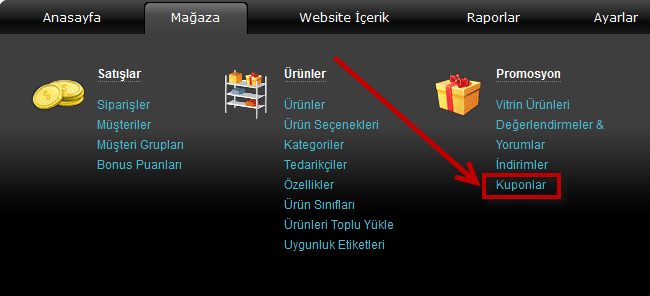 1. Menü'den "Mağaza" >> "Promosyon" altında "Kuponlar" bağlantısına tıklayın.