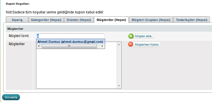 "Müsteri İsmi" alanına müşteri ismini girin (tam ismini veya bir kısmını). "Müsteri İsmi" alanında girdiğiniz isimle ilgili tüm sonuçlar açılır menü şeklinde çıkacaktır. Müşteri seçtikten sonra "Müşteri ekle" butonunu kullanarak müşteriyi alttaki listeye ekleyin. Bu şekilde müşteriyi kupona krıter olarak ekleyebilirsiniz. Ekledikten sonra "Oluştur" butonuna basarak değişiklikleri kaydedin.