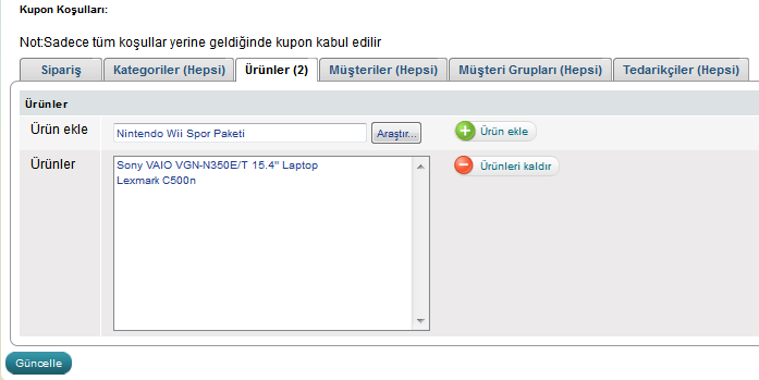 Kuponlara bir veya birden fazla koşullar koyabilirsiniz. Kopon koşulları 6 böşüme ayrılıyor: sipariş, kategoriler, müşteriler, müşteri grupları, ürünler ve tedarikçiler.