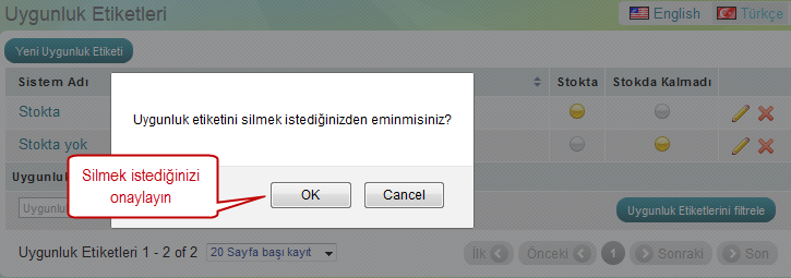 Açılan sayfada silmek istediğinizi onayladıktan sonra etiket silinecektir.
