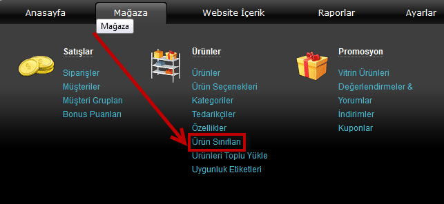 Ürün sınıfı oluşturmak oldukça kolay ve keyiflidir. Menü'den "Mağaza" >> "Ürün Sınıfları" bağlantısın...
