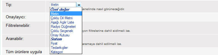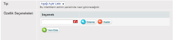 Tip "Aşağı Açılır Liste" - Bu tip özellikler için özellik seçenekleri girilmesi gerekiyor. Her özellik seçeneği aşağı açılır menüde yeni bir seçenektir.