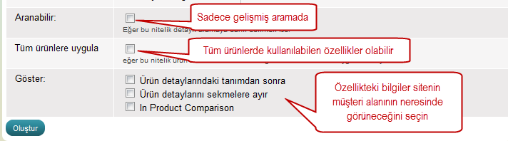 Önemli: Eğer "Göster" alanında hiç bir kutuyu işaretlemez iseniz özellik sitenin müşteri alanında hiç bir yerde görüntülenmeyecektir. Bu sık raslanan bir sorundur.