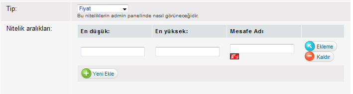 Tip "Fiyat" - Bu tip özelliklere farklı fiyatlar ekleyebilirsiniz. "En düşük" ve "En düşük" alanları sayısal değerlerdir, "Mesafe Adı" alani ise metin şeklinde olabilir.