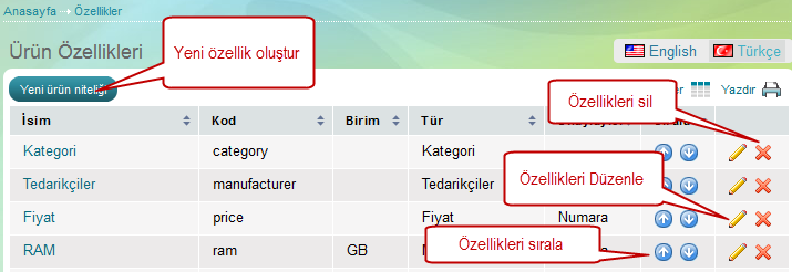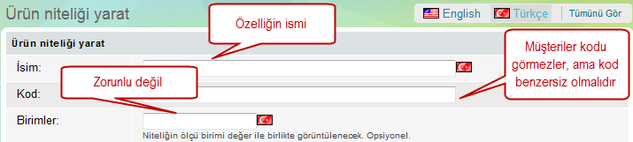 Kod: Kod alanı zorunlu bir alandır, ama müşteri kısmında görünmez. Ayrıca her özelliğin kodu benzersiz olması gerekiyor.