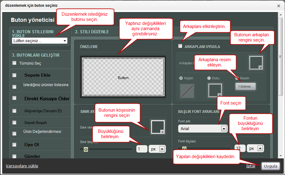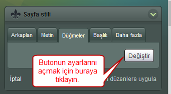 Arkaplan Rengi - Paleti kullanarak butonun arka plan rengini değiştirebilirsiniz. Arka plana bir doku veya bilgisayarınızdan seçebileceğiniz bir resim yükleyebilirsiniz.