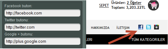 5.2 Facebook, Twitter ve Google+ butonları. Mağazanın üst kısmında sosyal ağların kuçuk simgelerini göreceksiniz. Müşterilerin simgelere tıkladıkları zaman nereye yönlendirileceklerini girin.