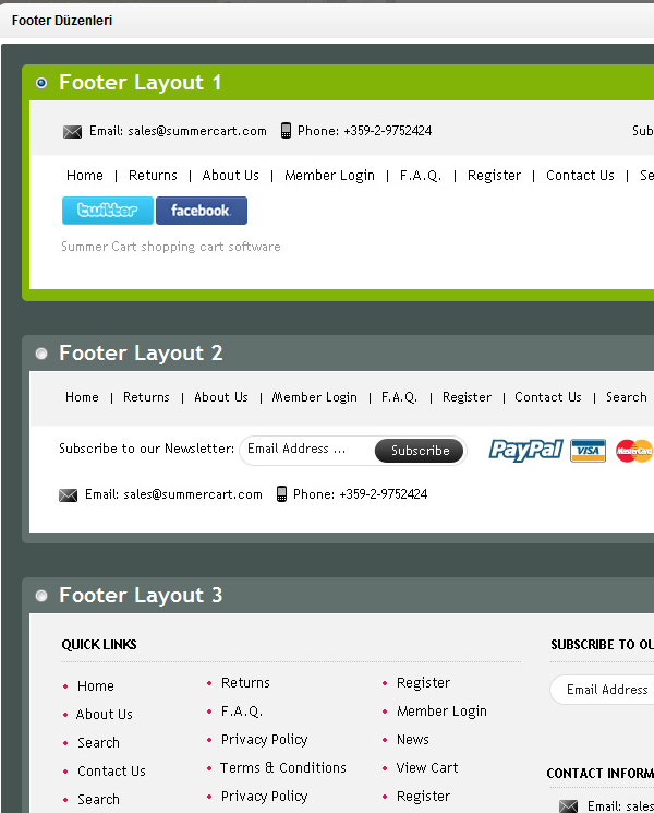 Mağazanın alt kısmı için düzen seçebileceğiniz bir sayfa açılacak. Düzenler önceden tanımlı ve 5 tane. Kullanmak istediğiniz düzenin üstüne tıklayın.