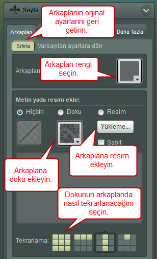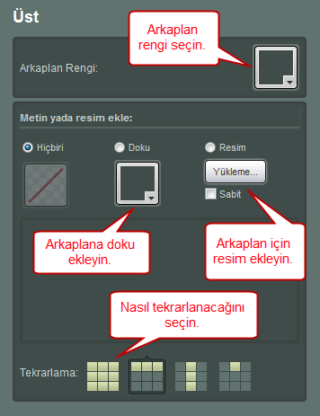 Doku veya Resim ekle - Önceden tanımlanmış dokulardan arka plana doku ekleyebilir veya "Yükle" butonuna tıklayarak resim ekleyebilirsiniz. Arka plan için resim eklerseniz "Sabit" kutusunu işaretleyerek resmin hareket etmemesini sağlayabilirsiniz, yani fare ile aşarı yükarı dolaşırken resim sabit durur.