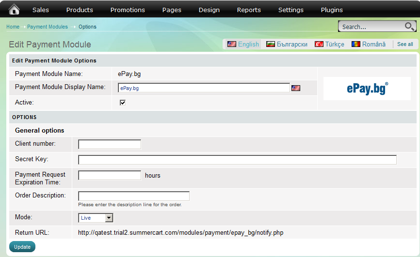 Summer Cart system automatically generates Return URL and displays it. Store owner has to send it to Epay.bg so that Epay.bg can make asynchronous payment notifications. This is to prevent the store owner from not being notified about any payment. |